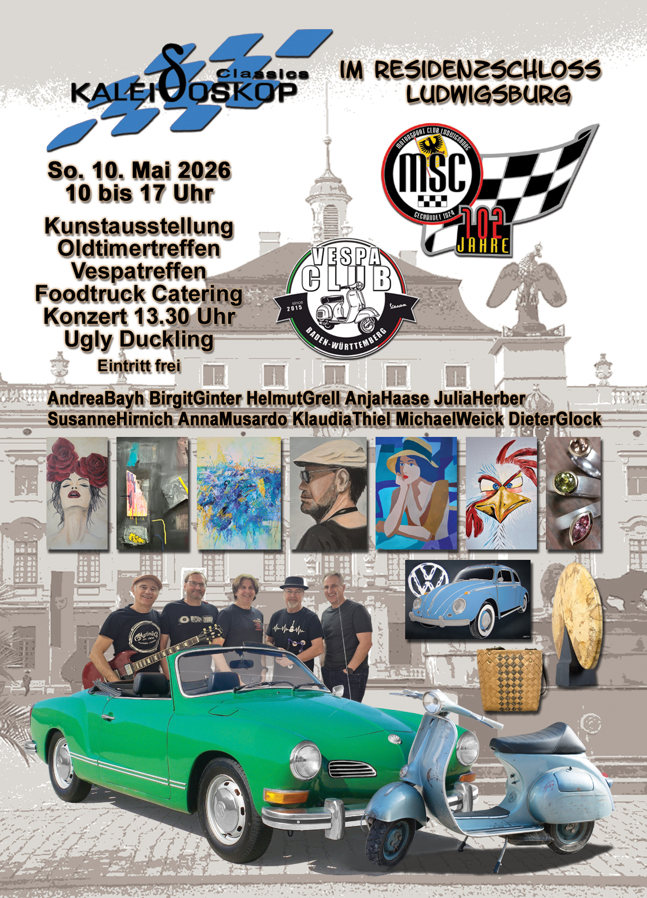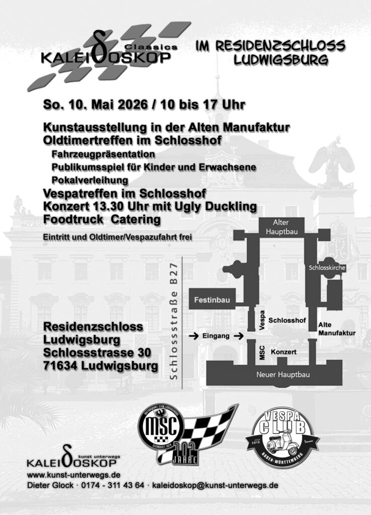 Ein weiteres Highlight wartet dann am 10.05.2026 auf Euch und uns. Wie auch 2025 spielen im Hof des Residenzschlosses in Ludwigsburg. Hier könnt ihr neben unserer Musik noch Kunst (Kaleidoskop – Kunst unterwegs) und schöne Oldtimer bewundern.